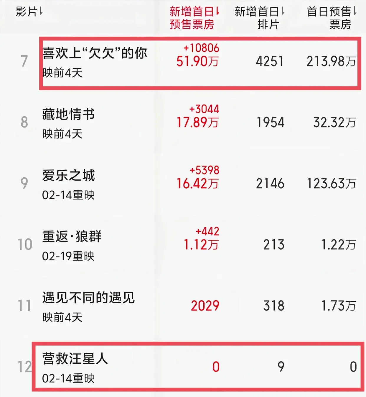至于春节前三天,情东谈主节上映的《心爱上“欠欠”的你》《藏地情书》《碰见不同的碰见》《调停汪星东谈主》,不错看出来它们是念念通缺陷峰放映的情势,拿到尽可能多的票房,但说明目下的数据来看,情况貌似有些阻遏乐不雅。