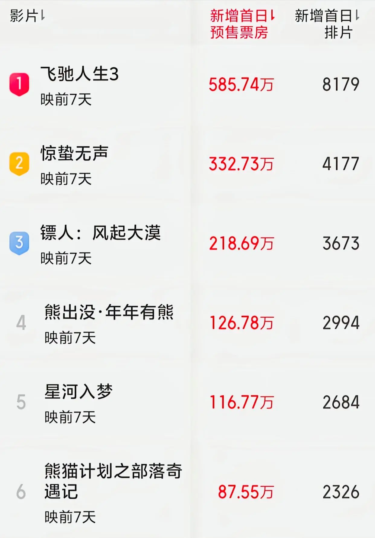 当今就看《飞奔东谈主生3》的后续口碑怎么。因为就目下的情况来看,张艺谋握导的《惊蛰无声》,跟吴京主演的《镖东谈主》,齐莫得它的预售高,只须口碑稳得住,春节档冠军就提前平直了。