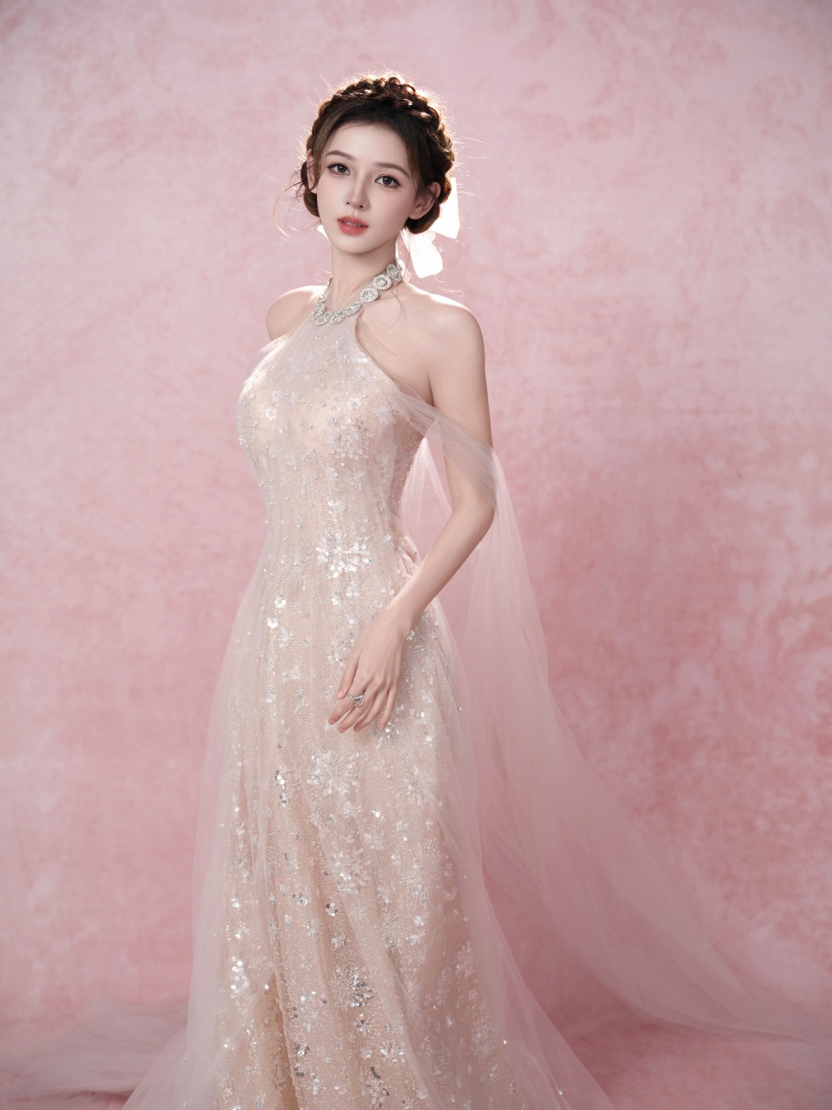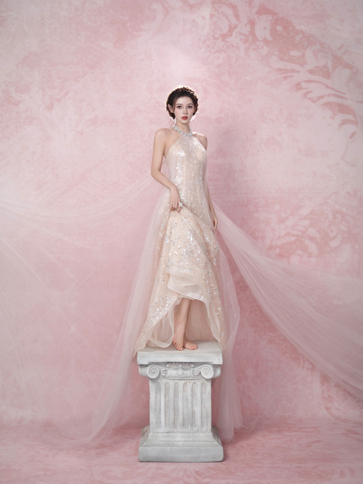 当粉雾般的布景晕开隐隐的肌理,张予曦便站在这一派和顺的氤氲里,成了时光里最动东说念主的时局。挂脖式的纱裙贴合着肩颈的线条,细碎的银白亮片似揉碎的星光,从领口全部铺陈至裙摆,在光影里漾开细碎的明后。裸色的裙摆勾画出腰围的纤细,高开叉的缠绵偶尔潜入莹白的足踝,站在维合手的雕花石柱上时,又添了几分不吃烟焰火的冰寒,仿佛是从古典画卷中走出的佳东说念主,又带着当代青娥的灵动鲜嫩。