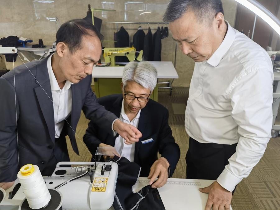 张贵明(左一)、吴文青(右一)与共事计划西服制作。受访者提供