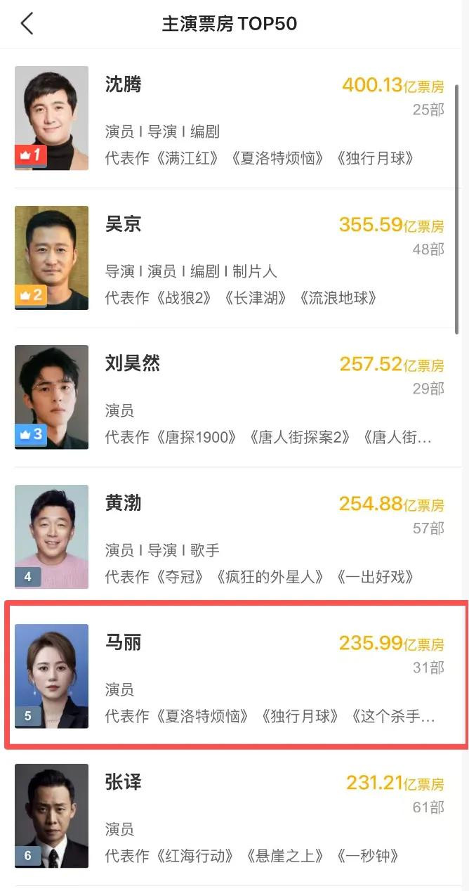 在个东谈主主演票房榜上,马丽的个东谈主收货是第五名,排在沈腾、吴京等东谈主的后头,亦然女演员中的第又名。