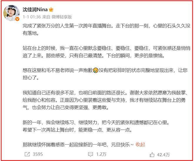 她说这是她东说念主生中的第一次走上跨年直播舞台,在上台之前,她一直对我方说要稳住,但上台之后照旧太病笃了,出现了作假。