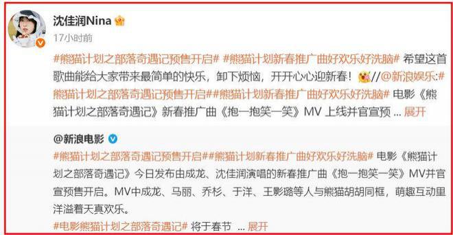 这首歌名叫《抱一抱,笑一笑》,是电影《熊猫想象之部落奇遇记》的新春履行曲。而与她齐唱的东说念主恰是这部电影的主演成龙。